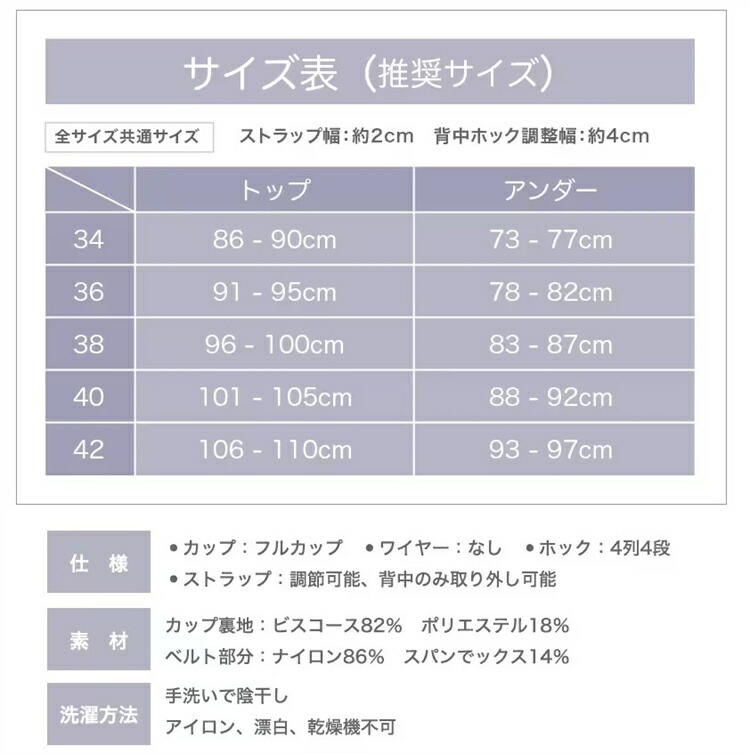 ・カップ:フルカップ ・ワイヤー:なし ・ホック:4列4段 ・ストラップ:調節可能、背中のみ取り外し可能