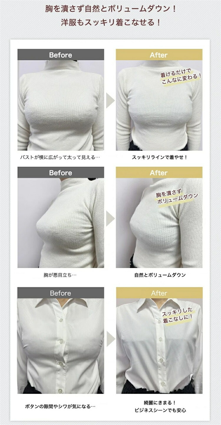 胸を潰さず自然とボリュームダウンするのでバストをスッキリラインに補正。
