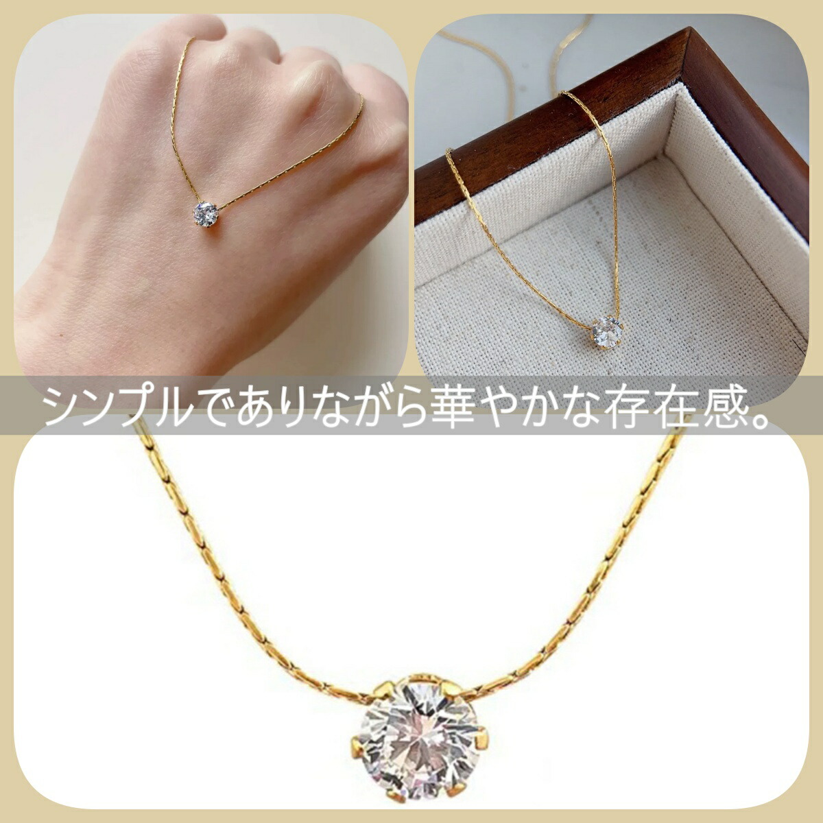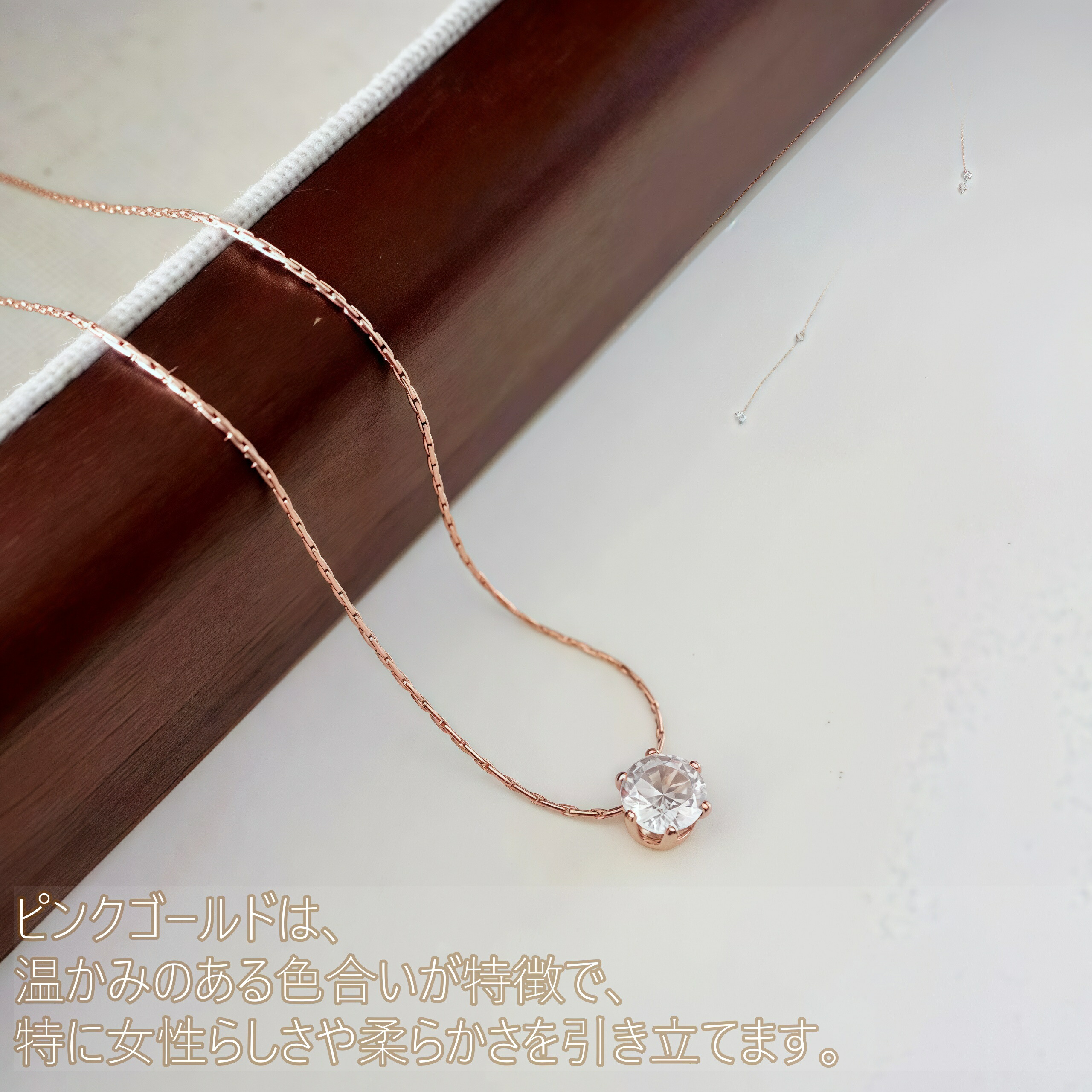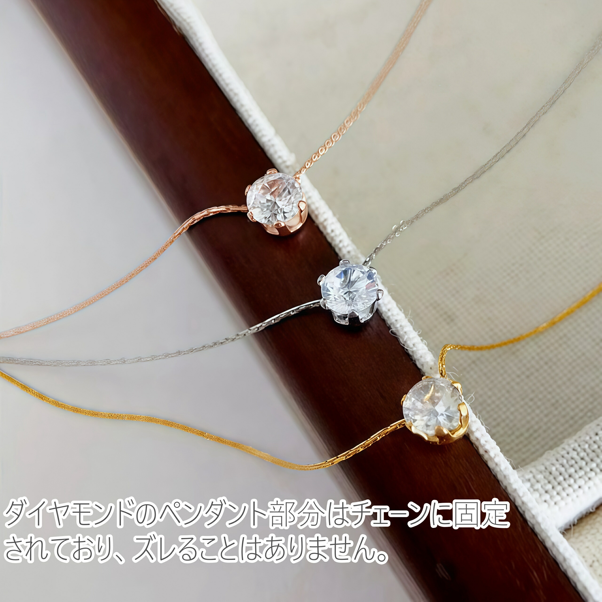 上質なステンレスにK18コーティングを施し、3色(ピンクゴールド、ゴールド、シルバー)からお好きな色を選べます。日常使いに最適なシンプルさを持ちながら、5A級ダイヤモンドの輝きが胸元を華やかに演出。