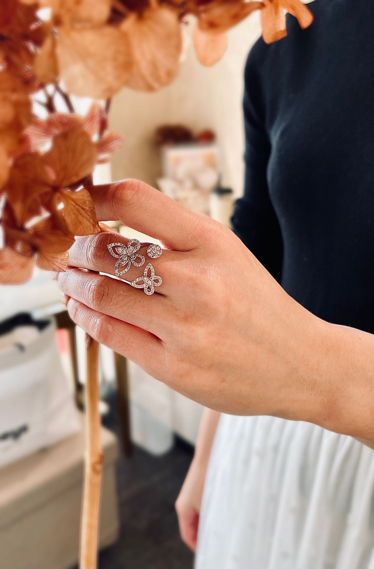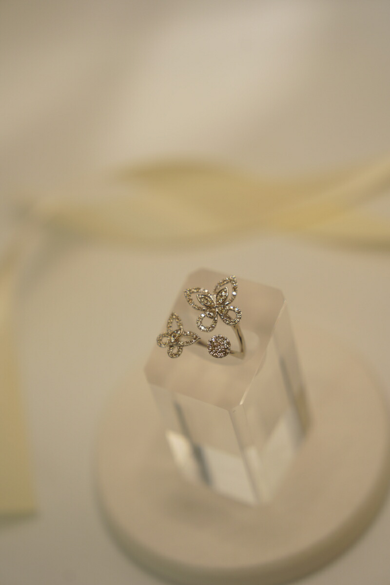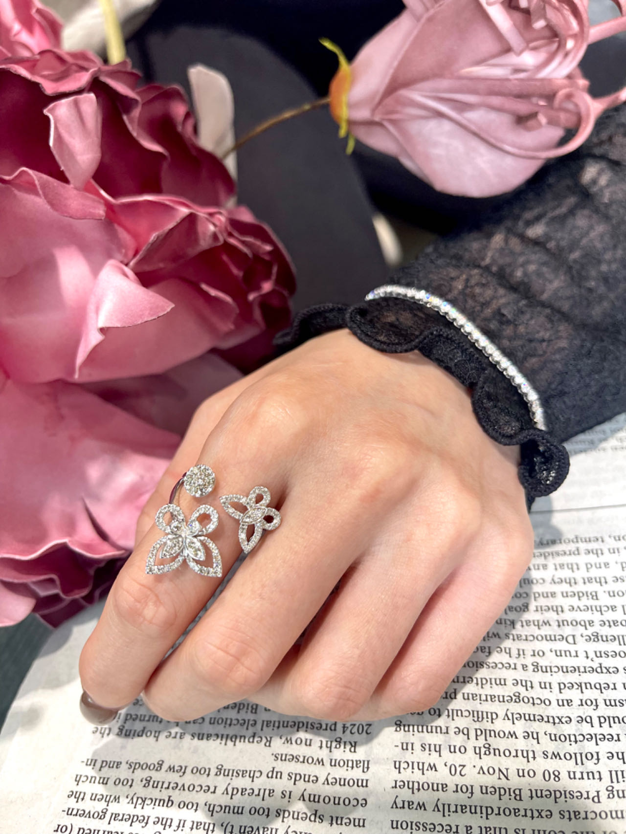 【高品質】ダイヤモンドリング K18【品質保証書付】ホワイトゴールド オープンリング 花 蕾 蝶々 モチーフ 金 ダイヤ 18金 日本製 ラグジュアリー ゴージャス プレゼント 存在感