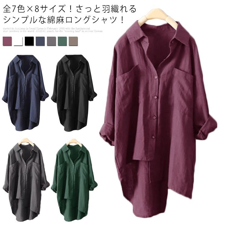 全7色×8サイズ 綿麻シャツ レディー レディースファッション 超目玉商品 ホワイト ブラック モカ グレー グリーン パープル 紺 S M L XL 2XL 3XL 4XL 5XL