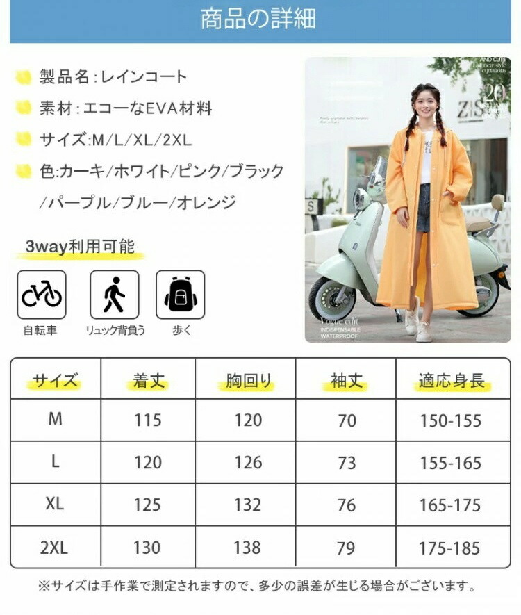 急な悪天候にもすぐに対応できるファスナー&シール式デザインを採用しています。簡単に着脱できるので、急な雨にも安心です。他のレインコートとは異なり、当店のレインコートは高品質のEVA素材を使用しており、長くご愛用いただけます。自転車や原付をお使いの方にもおすすめです。リュックを背負ったままでも楽に着られる、ロング丈のオーバーサイズ設計で、しっかりと体を守ってくれます。