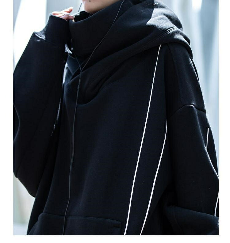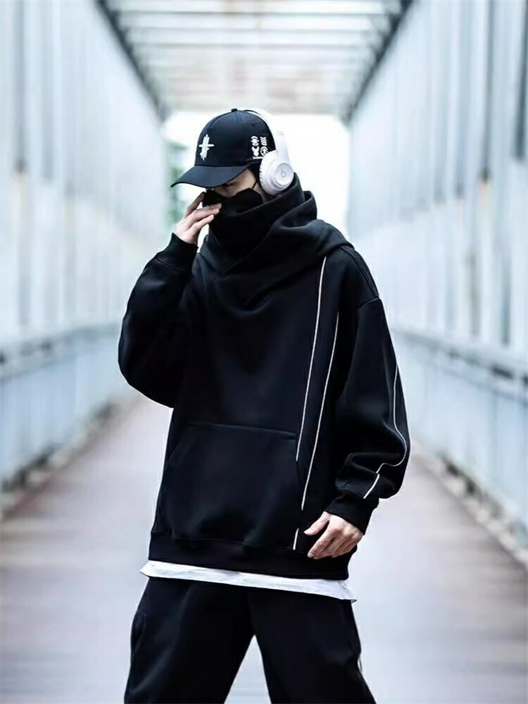 ボリュームネックパーカー 忍者パーカー 防寒保温 機能的 流れ星ラインプリントデザイン お肌に優しい 毛玉防止 色褪せない 吸湿&通気 柔らか アウターカジュアル メンズフルジップ 外出 通学 ゆったり ブラック 男女兼用 春秋冬