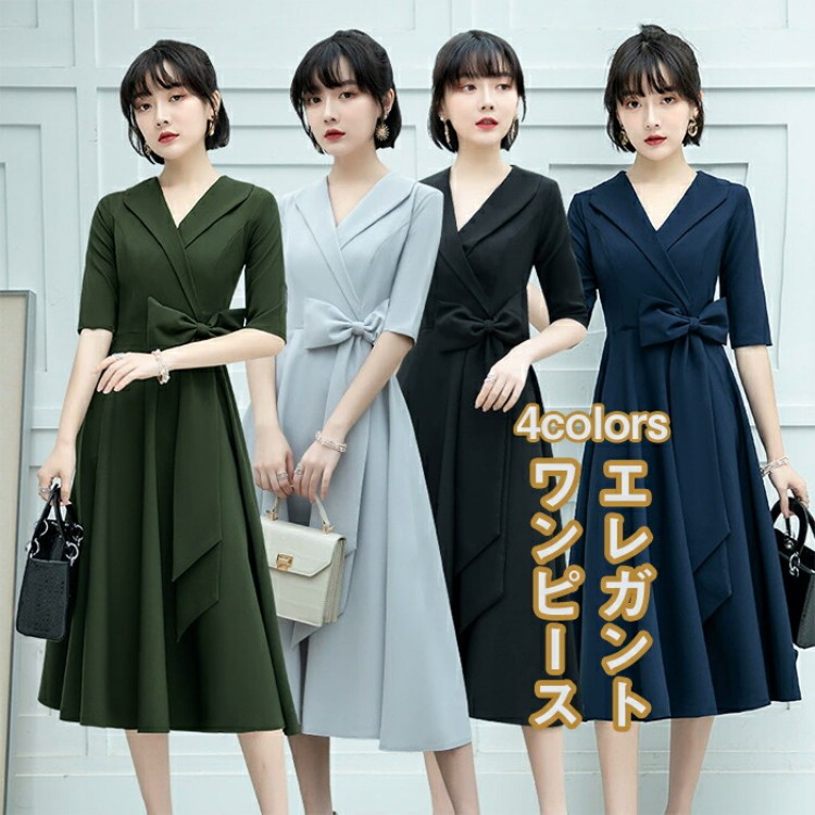 ワンピース レディース 中袖 Aライン 無地 膝下丈 細見え 着痩せ 体型カバー 夏 春秋 シンプル 女性 xS-3XL ロング エレガント ドレス