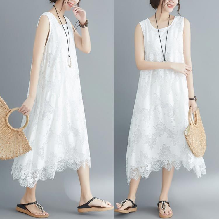 夏ワンピ レディース 体型カバー 袖なし ノースリーブ Uネック 無地 フェミニン ロングワンピース Aライン おしゃれ レースワンピース 夏