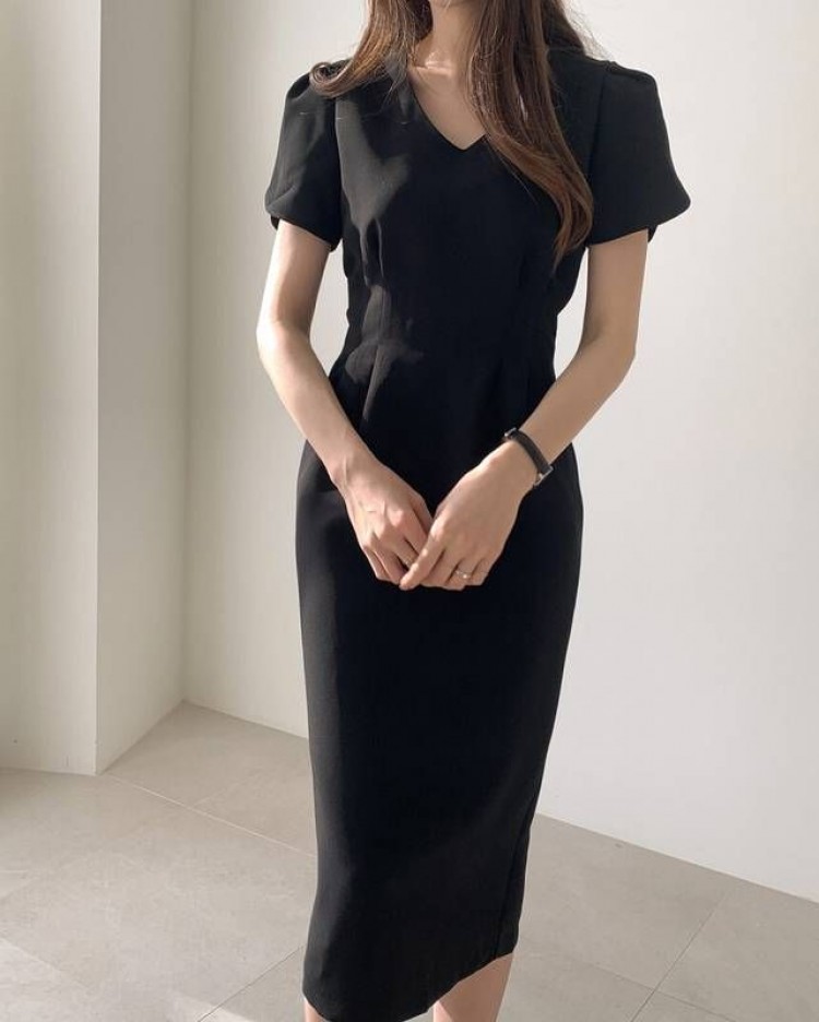 2色展開 エレガント ミモレ 半袖 S ストレート ハイウエスト 大人 ベージュ ワンピース ブラック M 休日 ロング 夏 無地 こなれ感 Vネック お出かけ ママ カジュアル 普段使い デ カバー