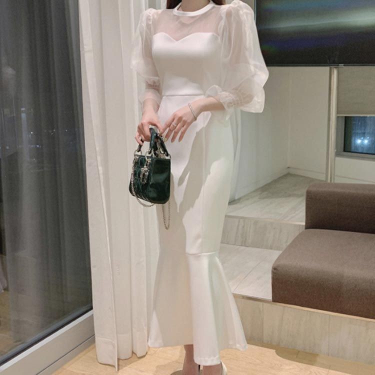 シースルーバルーンスリーブ パーティードレス ロング 韓国 お呼ばれ ドレス マーメイド ワンピース ロングワンピース 可愛い 結婚式 二次会 披露会 同窓会 成人式 卒業式 演奏会