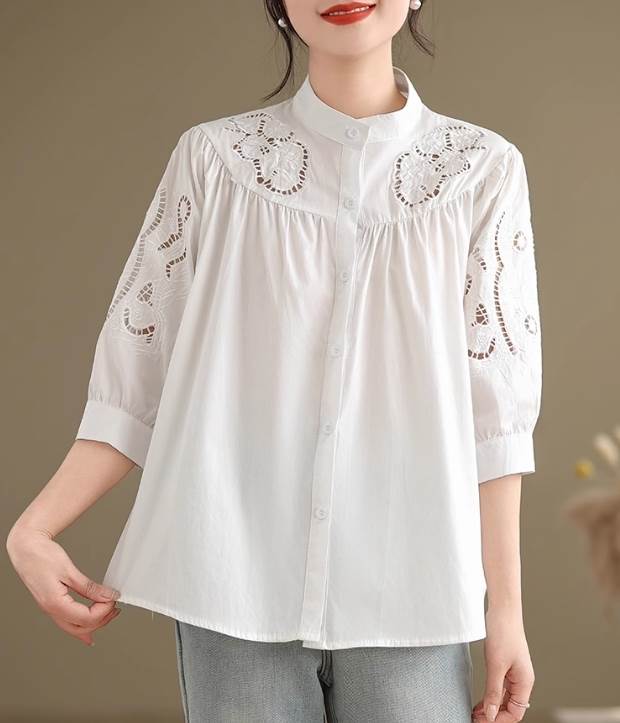 トップス レディース シャツ ブラウス 白シャツ 白トップス 夏 普通丈トップス 七分袖 二の腕カバー スタンドカラー ストレート レース ハリ感 カラバリあり 黒 ホワイト 白 ブラック