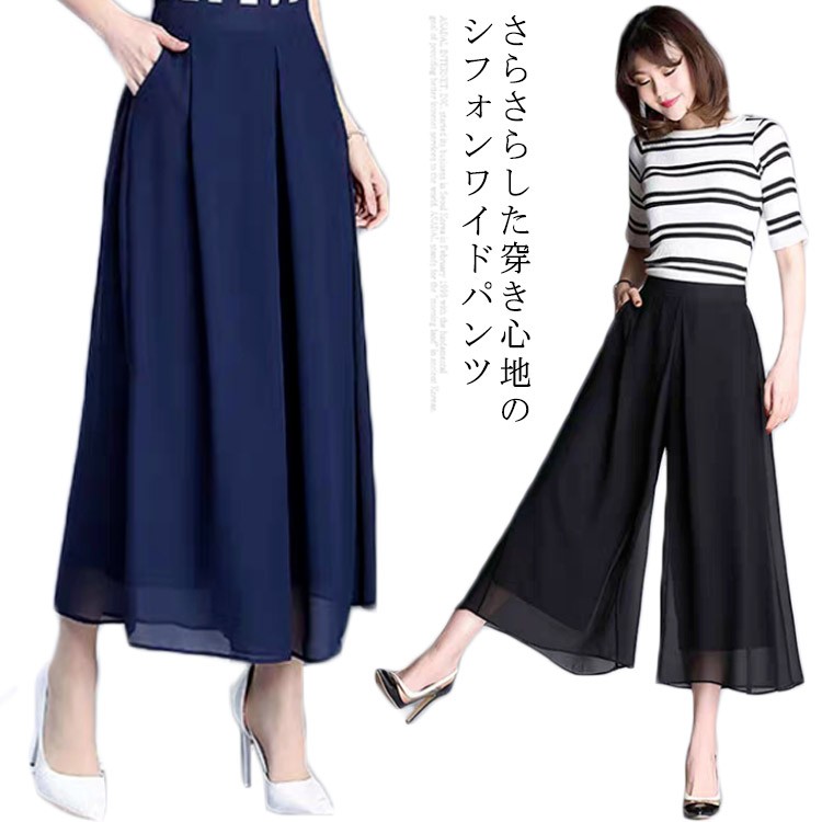 シフォン ガウチョパンツ ワイドパンツ レディース 9分丈 パンツ 涼感素材 フレアパンツ