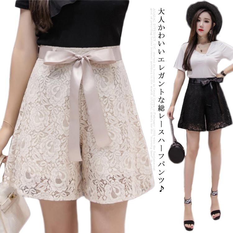 総レース ハーフパンツ ワイドパンツ レディース ガウチョパンツ フレアパンツ ショートパンツ レース パンツ ウエストゴム リボン キレイ目 おしゃれ 美脚 裏地付き カジュアル 夏