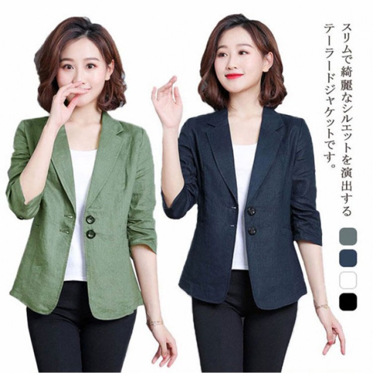 春 ジャケット レディース カジュアル 綿麻 テーラードジャケット サマー 涼しい 軽量 洗える 春夏 薄手 ゆったり 七分袖 ミディアム丈 リネン シンプル オフィス 通勤 ビジネス