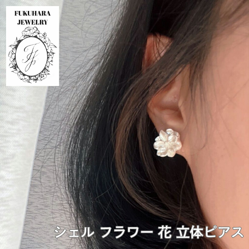 イヤリング ピアス シェル フラワー 花 立体 低アレルギー レディース スタッドピアス 貝 キュービックジルコニア ビジュー 大人 可愛い ゴールド シルバー