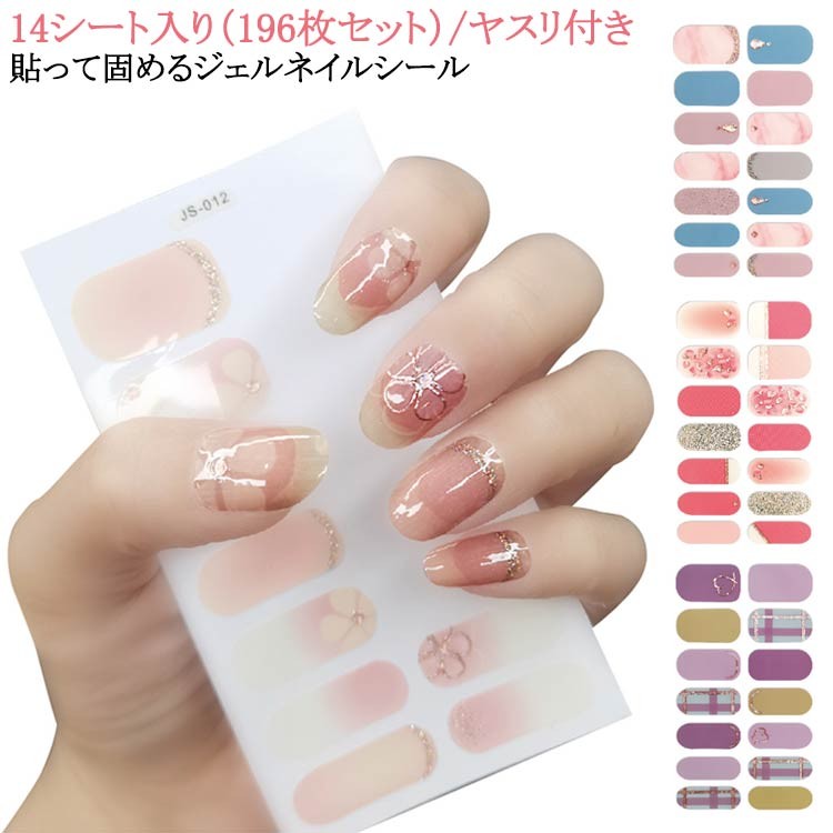 硬化タイプ ジェルネイルシール お得な14枚セット 196枚入り ピンク シンプル 花柄 ラメ 硬化 セルフネ 1シート14枚 半硬化 貼って固めるジェルネイルシール
