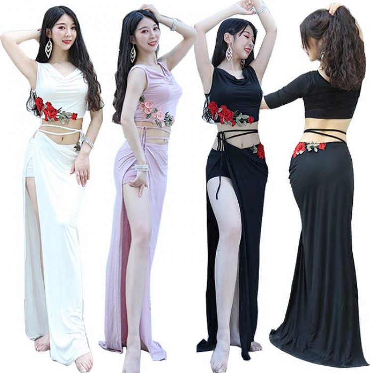 ベリーダンス 衣装 セット 袖 2タイプ トップス スリット入り スカート 2点セット レッスン着 練習着 セットアップ ダンス 社交ダンス レッスンウェア レ ステージ衣装
