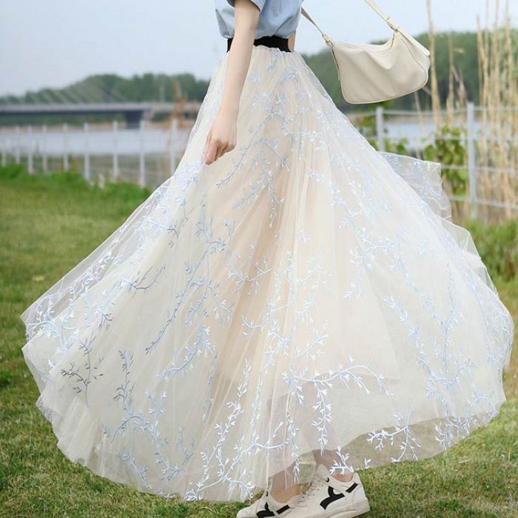 優雅な刺繍が施されたチュールスカート。ミモレ丈で軽やかなフレア感を演出し、ウエストゴムで快適な履き心地。30代から50代の女性にぴったりなエレガントな一枚。