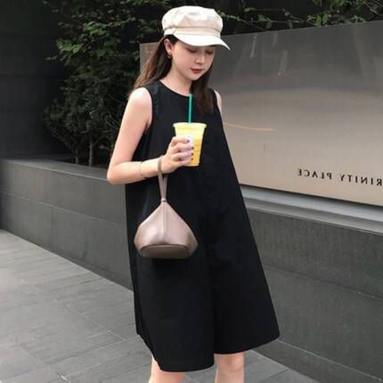 XL ポケット オーバーオール M 襟なし ハーフサロペット おしゃれ ラウンドネック L 10代 ノースリーブ 膝丈 カーキ ブラック 袖なし かわいい 20代 オールインワン 夏 S マニ ルーズ