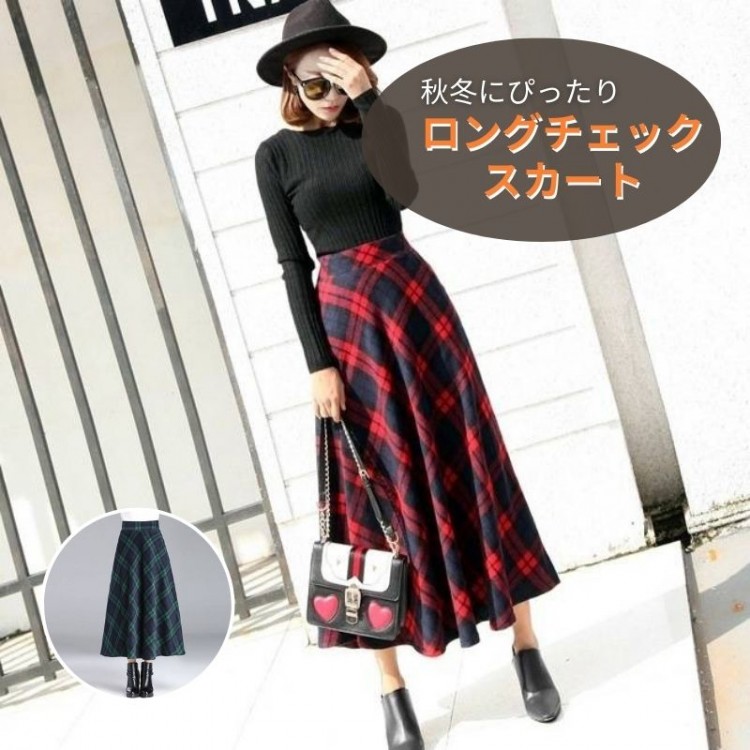 ロング スカート レディース 秋 冬 チェック柄 レッド グリーン 2色展開 Aライン フレア ハイウエスト ウエストマーク 休日 お出かけ デート コーデ ガーリー お洒落 普段使い きれい