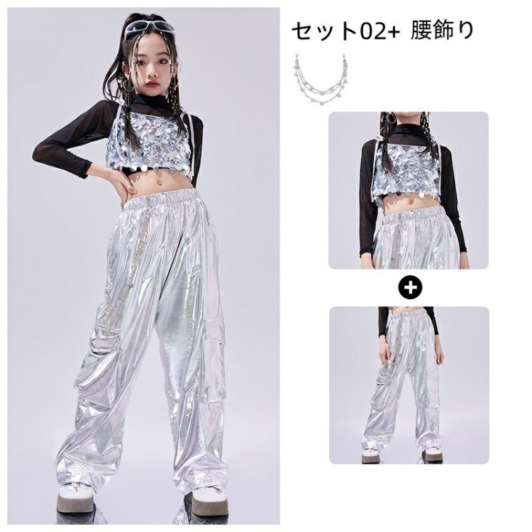 キッズ ダンス衣装 メタル へそ出し キラキラ 銀 セットアップ イベント かっこいい 女の子 男の子 韓国 ヒップホップ HIPHOP K-POP ジャズ 練習着 ダンスウェア ダンス ストリート