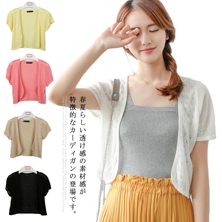 カーディガン レディース 透け感 半袖 サマーカーディガン ショート丈 透かし ニットカーディガン サマーニット