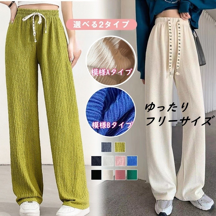 レディース ワイドパンツ ウエストゴム 体系カバー 涼しい 吸汗 ポップコーン素材 ゆったりリラックス 春夏 カジュアル ファッション 脚長効果 エンボス加工 美脚効果 ポケット付き