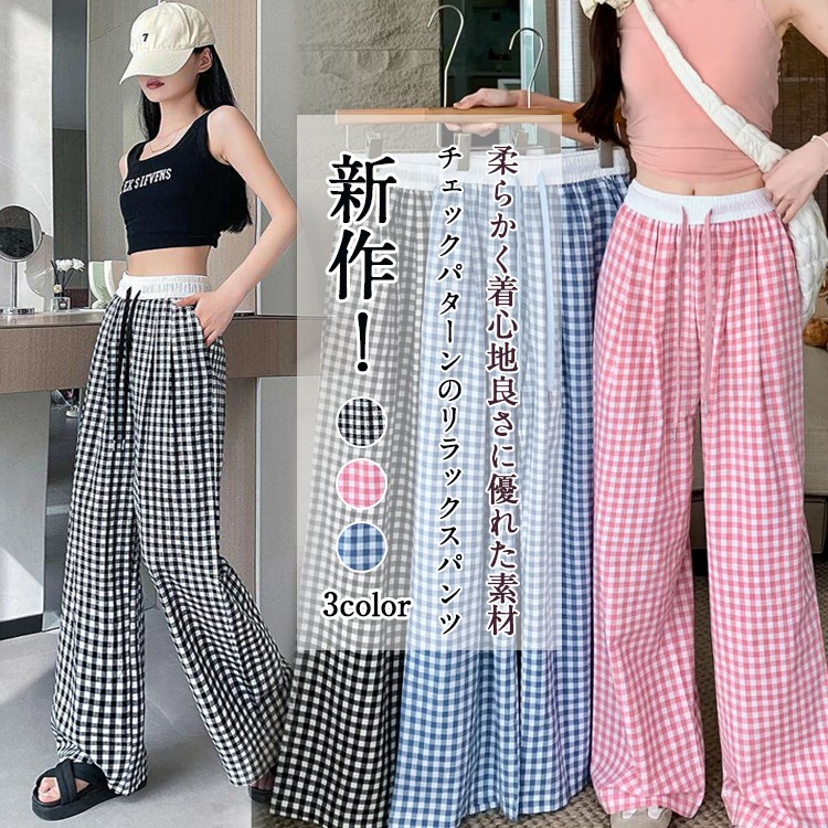 レディース ワイドパンツ 夏 春 新作 薄手パンツ チェック柄 海 旅行 カジュアル ゆったり パンツ 冷感 快適 ロングパンツ 脚長効果 ルームウェア ボトムス 日焼け冷房対策 部屋着