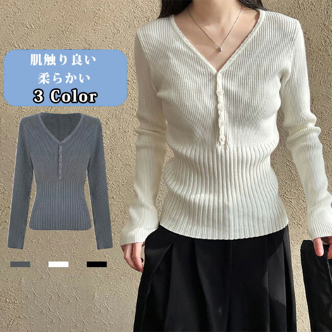 ニット レディース トップス チクチクしない 長袖 リブ Vネック ハーフボタン フィット感 無地 カジュアル キレイめ 肌触り良い 柔らかい 快適 シンプル インナー レイヤード 伸縮性