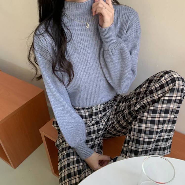 トップス セーター ニット ミディアム レディース 長袖 ボリューム袖 ハイカラー リブ 大人 可愛い シンプル カジュアル