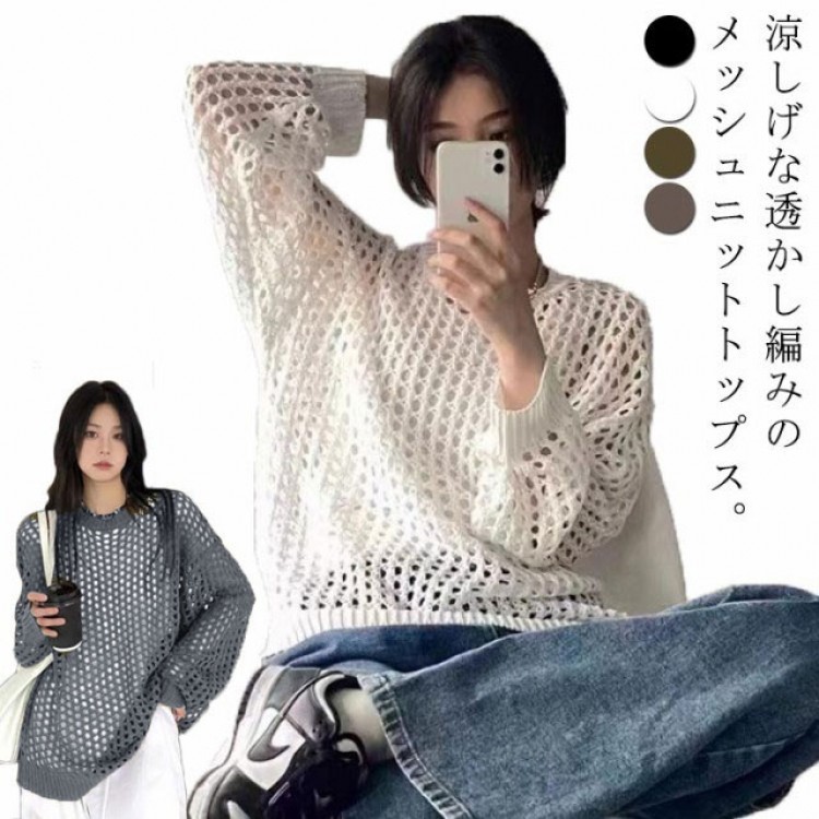 透かし編みニット 体型カバー クルーネック サマーニット ゆったり レディース プルオーバー 長袖 メッシュニット メッシュ編み セーター トップス レイヤード 重ね着 オーバーサイズ