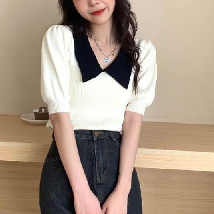 上品 レディース パフスリーブ イエロー 春 コントラストカラー 細身 ホワイト ス 夏 かわいい ニット ショート丈 ブラック 袖あり カットソー 半袖 プルオーバー 着回し シャツ 襟付き