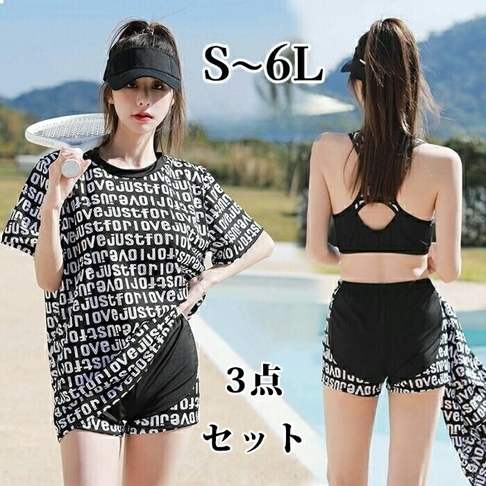 水着 レディース 大きいサイズ 3点セット タンキニ ラッシュガード 体型カバー ぽっちゃり ノンワイヤー パッド付 露出控えめ スポーティー 水陸両用 UVカット 3L 4L 6L 10代 2 5L