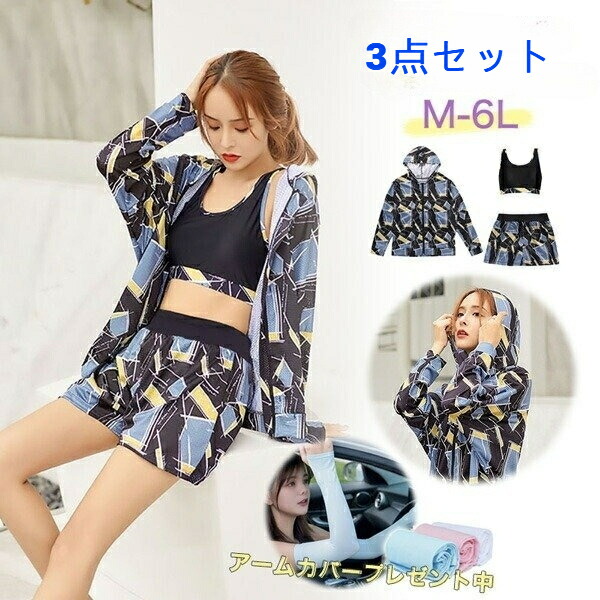 水着 3点セット 体型カバー レディース 大きいサイズ [二の腕 太もも お尻 お腹] 長袖ラッシュガード付き セパレート タンキニ×ショートパンツ 海水浴 ママ用 ブルー 20代-50代 温泉