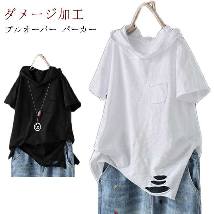 プルオーバー カットソー レディース トップス 半袖 ダメージ 体型カバー 無地 ゆる ビッグシルエット 半袖 黒 白 パーカー