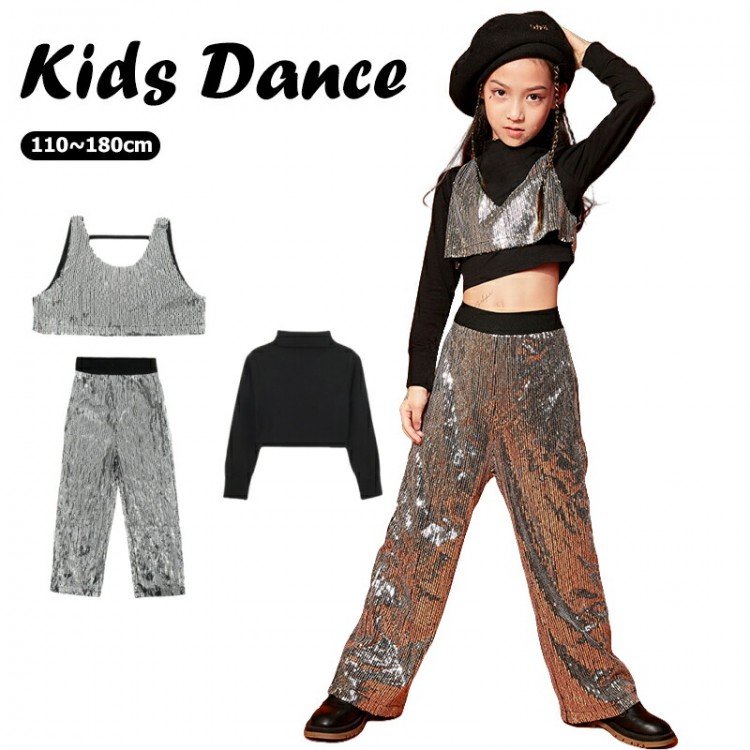 キッズ ダンス衣装 スパンコール キラキラ セットアップイベント かっこいい 女の子 韓国 ヒップホップ HIPHOP K-POP ジャズ ストリート ダンス ダンスウェア 団 発表会 演出服 練習着