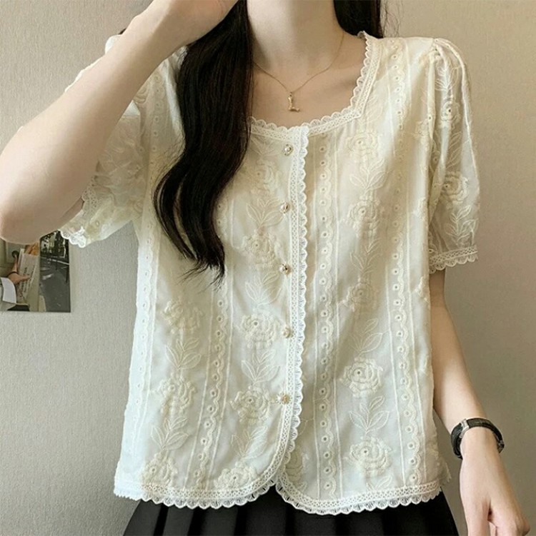 スクエアネックレース刺 半袖ブラウス レディース 夏 半袖シャツ ボリュームスリーブ きれいめ 白 ホワイト カジュアル OL ビジネス 通勤 韓国ファッション 可愛い お洒落 オフィス