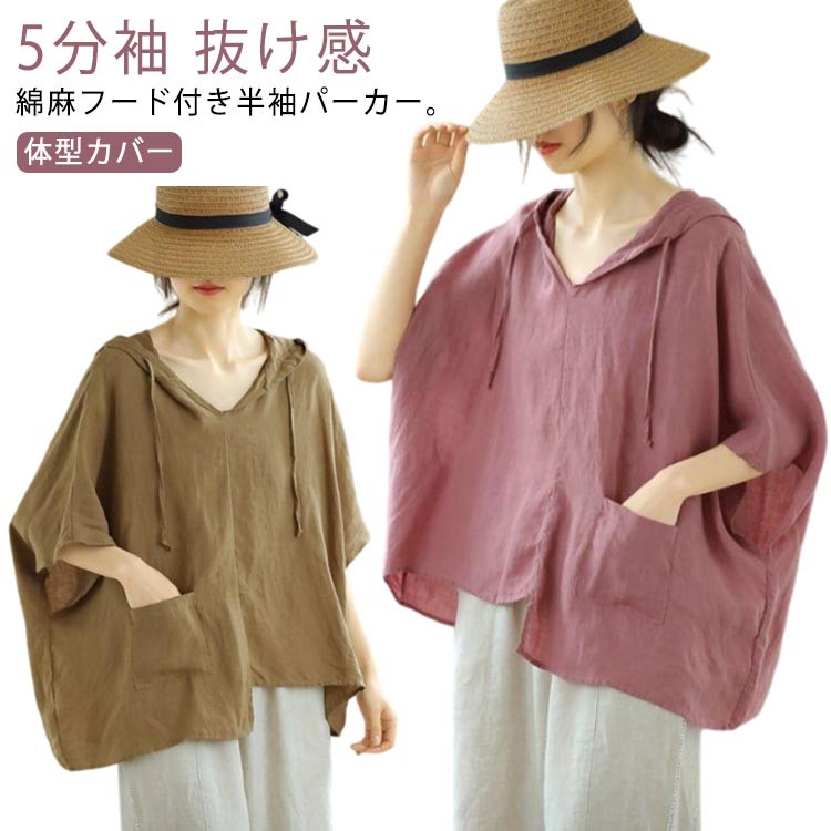 半袖 パーカー リネンパーカー 綿麻 プルオーバー フード付き ブラウス ドルマンスリーブ 5分袖 ゆったり フーディー トップス アシンメトリー 抜け感 夏 春 Tシャツ 韓国ファッション